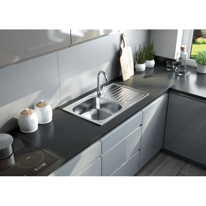 Високоміцна нержавіюча сталь. Кухонна раковина обладнана сифоном з підключенням до посудомийної машини. Природні антисептичні властивості сталі. Реверсивна сталева кухонна раковина-монтується з лівої або правої сторони.