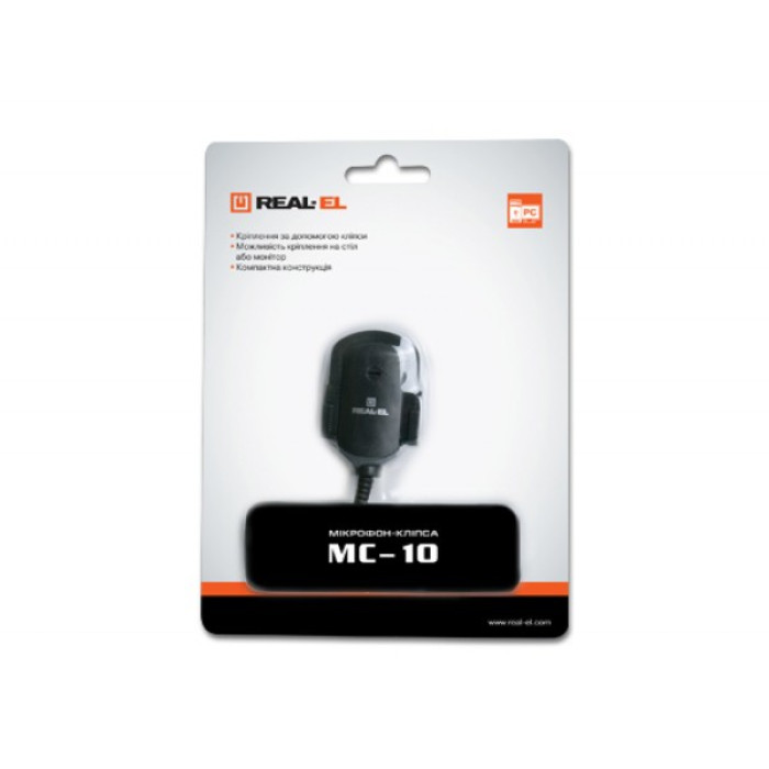 Мікрофон-кліпса REAL-EL MC-10 призначений для спілкування через Інтернет, запису слів i фраз під час вивчення іноземних мов. Мікрофон має кліпсу для кріплення на одязі, а також знімне кріплення, призначене для фіксації моделі на столі або на корпусі монітора.