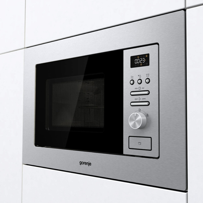 Мікрохвильова піч Gorenje вбудовувана, 20л, міх. управл., 800Вт, гриль, дисплей, інвертор, нерж
