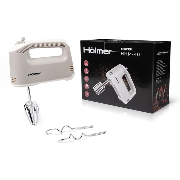Міксер має потужність 400 Вт, укомплектований вінчиками для збивання (2 шт.) та гаками для тіста (2 шт). Має 5 ступенів регулювання швидкості та прискорений турбо режим. Для безпечної роботи пристрою передбачено функцію захисту від перегріву. Holmer HHM-40 ідеально справляється із приготуванням різних кремів, мусів, пюре, а також замісом тіста будь-якої консистенції.