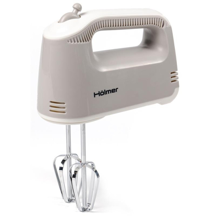 Модель Holmer HHM-40 покращеної ергономічної форми представлена у строгому сірому кольорі. Корпус міксера виготовлений з якісного пластику, а потужні вінчики для збивання та гаки для замішування тіста – хромованої сталі.