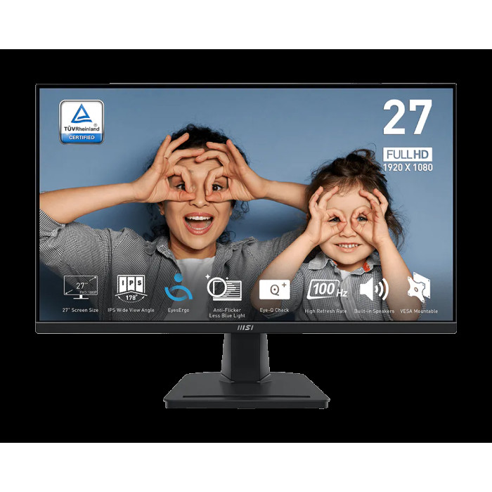 Монітор MSI PRO MP275 — 27-дюймовий IPS-екран з роздільною здатністю 1920x1080, частотою 100 Гц, часом відгуку 4 мс, охопленням sRGB 93%. Сертифікований TÜV для захисту зору, з Anti-Flicker та Less Blue Light, MSI Eye-Q Check для самоконтролю, вбудованими динаміками 2x2Вт та VESA-кріпленням. Підключення D-Sub, HDMI, аудіо, регулювання нахилу, чудово пасує для програмування, кодування та дизайну веб-сайтів.