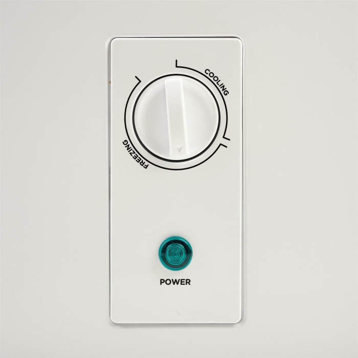 Ззовні на лицьовій стороні розміщений механічний регулятор температур та індикатор роботи скрині. Завдяки потужному компресору AU120CY1A та холодоагенту R600a морозилка здатна за добу заморозити до 9 кг продуктів. Енергоефективність класу E дозволяє споживати до 200 кВт на рік, при номінальному струмі 0,8 А.