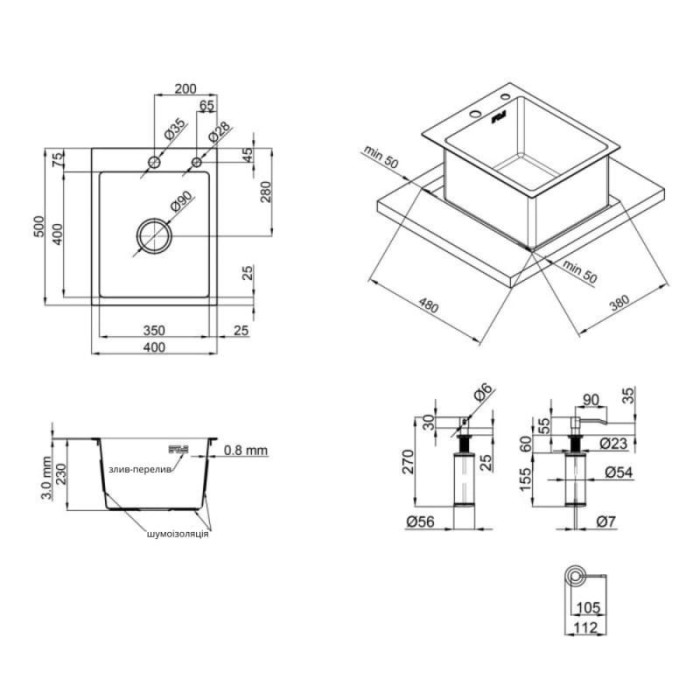 Мийка, сифон, злив/перелив, корзинчастий вентиль, дозатор, кріплення.