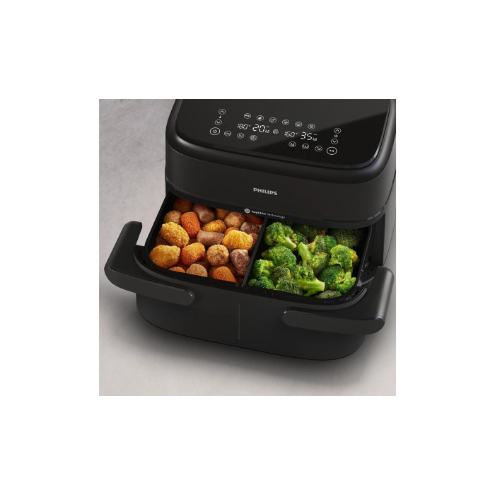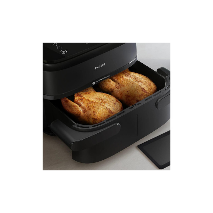Легко перемикайтеся між двома кошиками та загальним великим лотком за допомогою знімного роздільника. Готуйте все що завгодно - від страви з двох інгредієнтів до цілої курки - і насолоджуйтесь хрусткою скоринкою та ніжною м’якоттю з технологією RapidAir.
