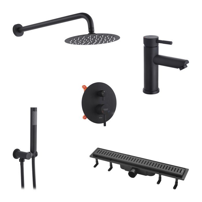 Змішувач, кронштейн для верхнього душу, лійка для верхнього душу, кронштейн для ручного душу, лійка для ручного душу, душовий шланг, кріплення. \ Змішувач, гнучка підводка, кріплення, інструкція. \ Трап з гратами, ніжки.