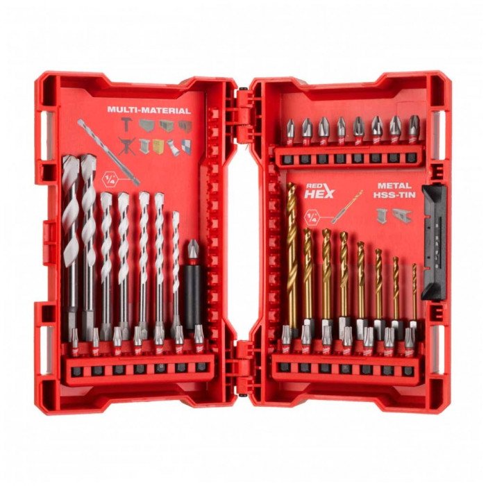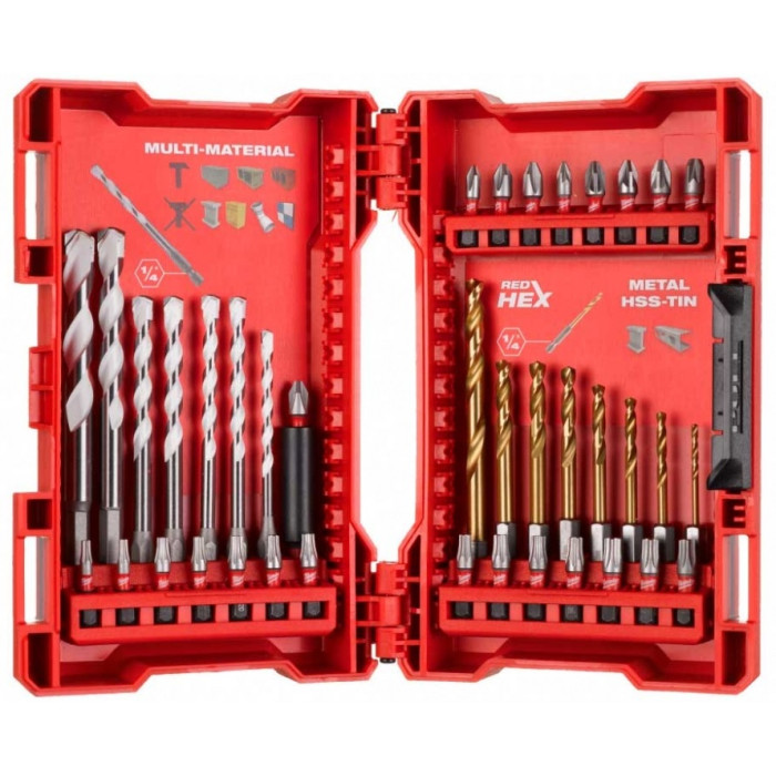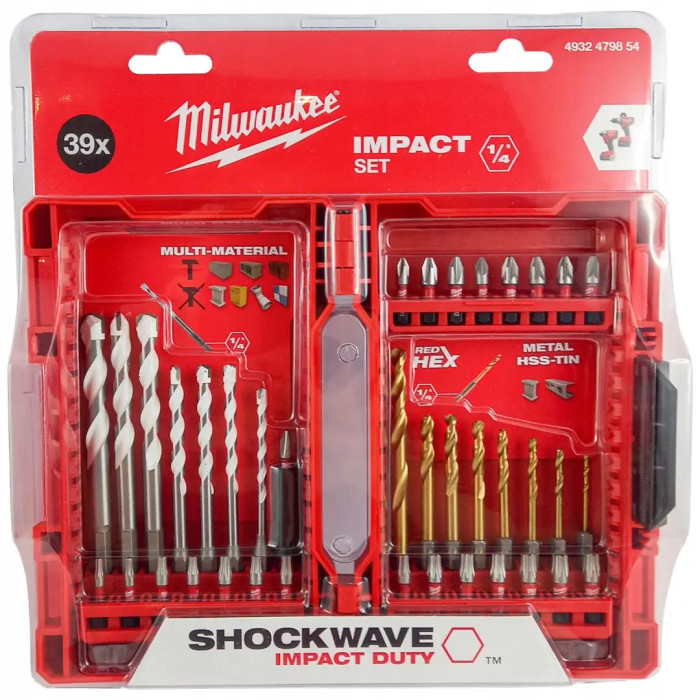 Набір свердел та біт Milwaukee SHOCKWAVE 39 шт. — це універсальний комплект, розроблений для професіоналів, які цінують надійність та довговічність інструментів при роботі з ударними шуруповертами та дрилями. Свердла SHOCKWAVE HSS-G TIN - спеціально розроблені для використання з ударними шуруповертами, мають ¼″ шестигранний хвостовик. Титанове покриття зменшує нагрівання та підвищує швидкість свердління.