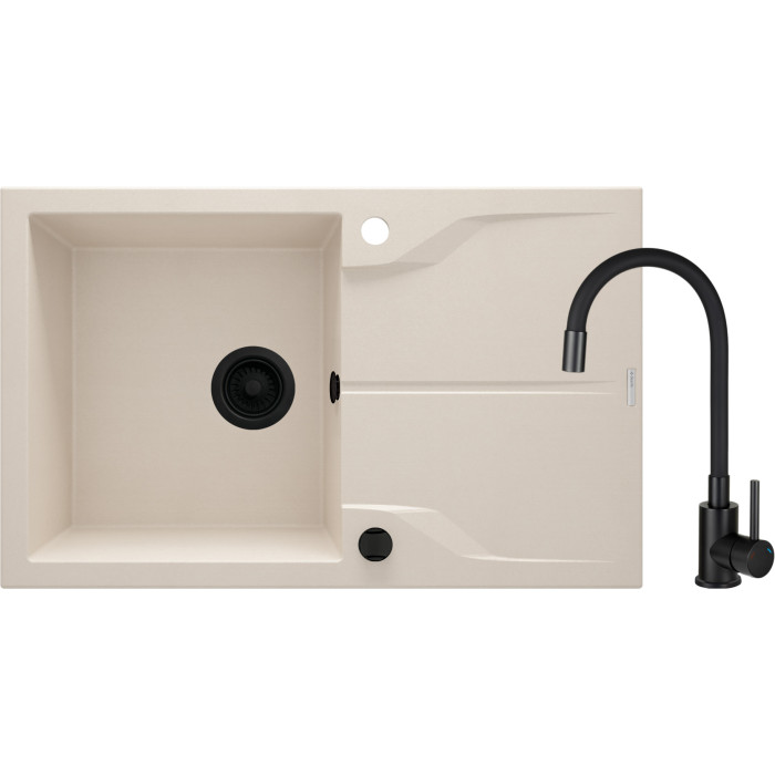 Набір для кухні Andante в бежевому кольорі поєднує стиль і функціональність. Комплект включає гранітну мийку з матовою поверхнею та однокамерним дизайном, з мінімальною шириною шафки 600 мм. Мийка має гідрофобні властивості, компактний сифон Space-Saver і можливість підключення посудомийної чи пральної машини. Змішувач із гнучким носиком забезпечує зручність користування, а його чорне оздоблення додає сучасного вигляду.