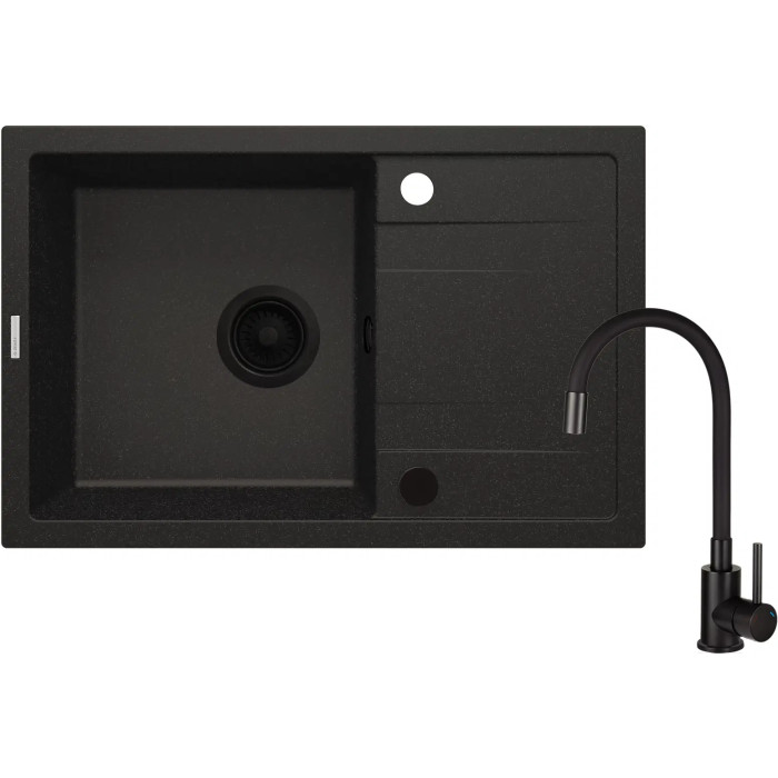 Deante Corio ZRCPG113 — кухонний набір, що включає гранітну мийку з крилом та змішувач у графітовому кольорі. Практичне рішення для сучасної кухні, яке поєднує функціональність, міцність і стиль.