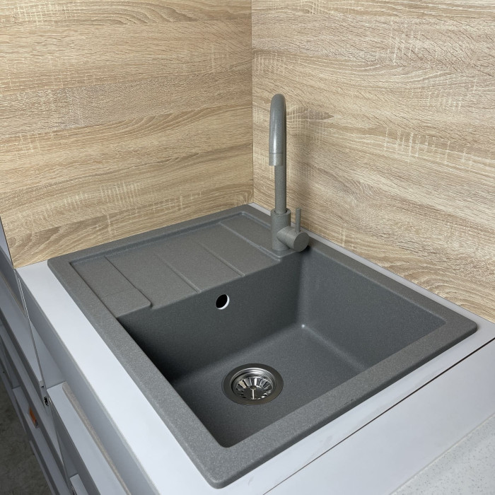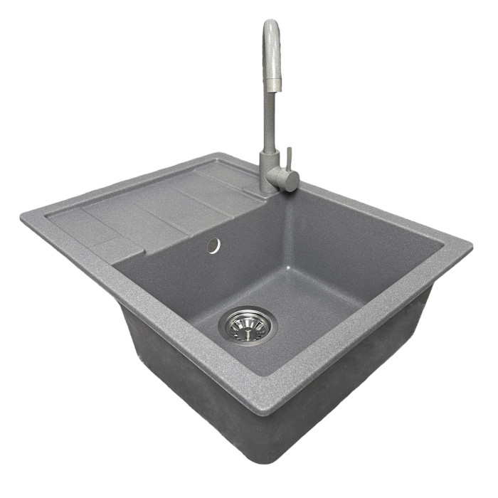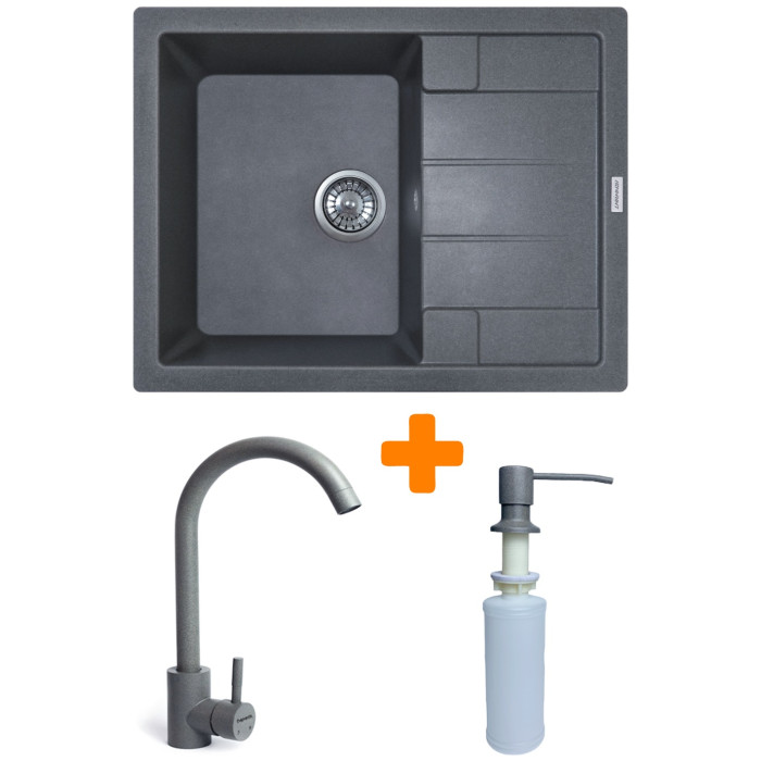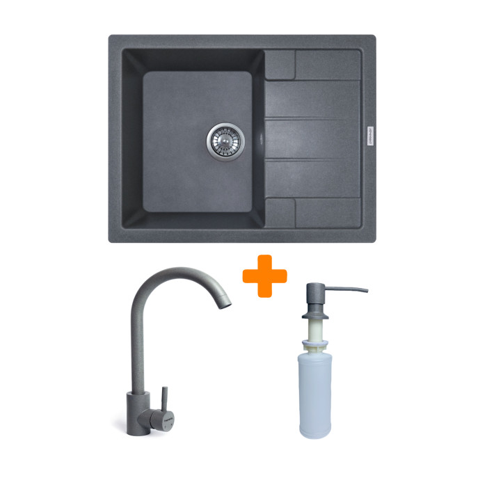 Набір кухонний Adamant Anila, штучний камінь, прямокут., з крилом, 645х495х200мм, чаша - 1, врізна, сірий + змішувач та дозатор
