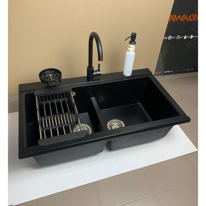 Набір кухонний Adamant Similar, штучний камінь, прямокут., без крила, 885x505x230мм, чаша - 2, врізна, чорний + змішувач + дозатор + ополіскувач склянок + коландер
