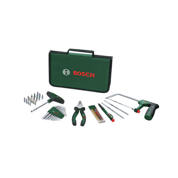 викрутка/(з Т-подібною рукояткою), плоскогубці/(комбіновані, 180 мм), змінні наконечники/(Ph 1/2/3; PZ 1/2/3; SL 4/5/6; TX 10/15/20/25/30, HEX 3/4/5/6), пильні полотна/2 шт., пенал для зберігання і транспортування, шестигранні ключі/10 шт. (1,5, 2, 2,5, 3