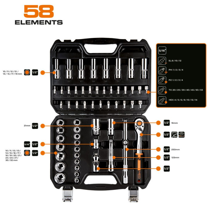 Набір торцевих ключів 1/2" NEO складається з 58 елементів, виготовлених із високоякісної хром-ванадієвої сталі. До складу набору входить тріскачка, що характеризується храповим механізмом (90 зубці) із подовженим ресурсом.