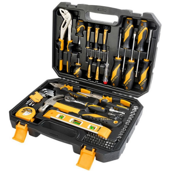 Набір інструментів Tolsen, 89 шт., універсальний 85352, включає в себе широкий асортимент інструментів для різних завдань. У комплект входять реверсивна тріскачка, викрутки різних типів і розмірів, прецизійні викрутки, тестер напруги, набір шестигранних ключів, комбіновані плоскогубці, плоскогубці для водяних насосів, вимірювальна стрічка, молоток, адаптери для біт, біти різних типів, головки, подовжувачі та міні-рівень. Усі інструменти зручно упаковані в корпус видувної форми для легкого зберігання та транспортування.