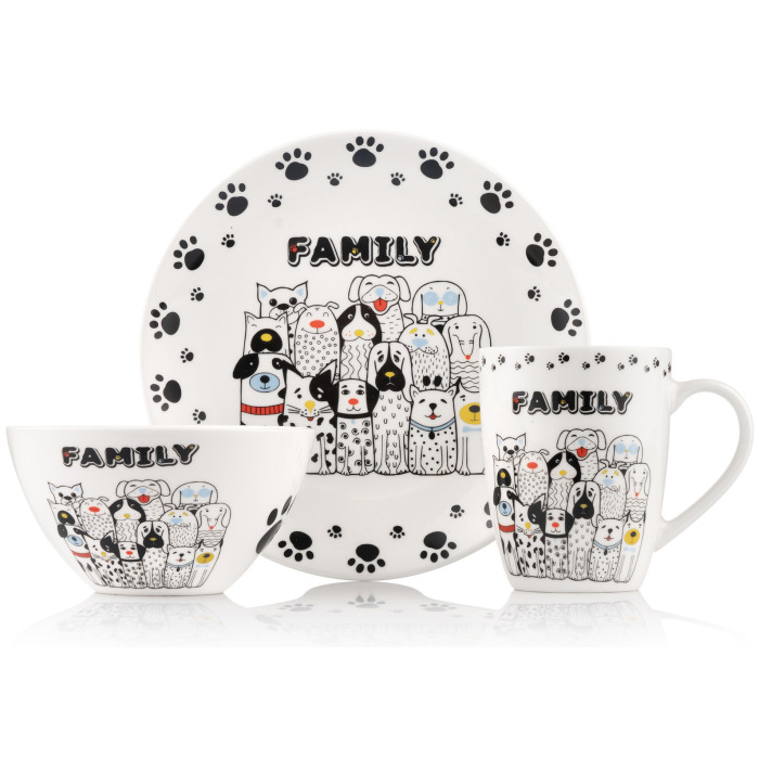 Набір посуду ARDESTO серії Family поєднує стиль і та практичність. Дизайн у білому кольорі з зображенням кумедних песиків поліпшує настрій і додає позитиву. У наборі 3 предмети: чашка об’ємом 320 мл, піала об’ємом 450 мл і тарілка діаметром 21 см. Посуд виготовлено з якісної порцеляни, міцної та стійкої до утворення сколів і тріщин, що зумовлює тривалий термін слугування. Вироби можна використовувати в мікрохвильовій печі та мити в посудомийній машині. Набір буде вдалим подарунком для близьких і друзів.