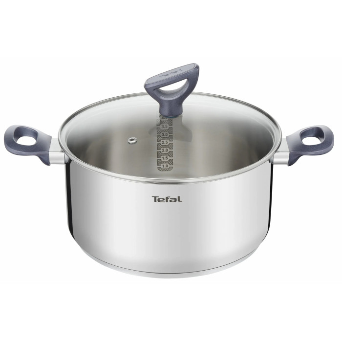 Набір посуду Tefal Daily Cook з 10 предметів виготовлений із нержавіючої сталі та розрахований на щоденне використання. У комплекті 4 каструлі, ковш і 5 скляних кришок із паровідводом. Товсте дно Full Induction забезпечує рівномірний нагрів, а мірні поділки всередині, ергономічні ручки, що залишаються холодними, та «напівстійка» кришка роблять процес приготування більш зручним. Набір сумісний з газовими, електричними, склокерамічними та індукційними плитами й можна мити в посудомийній машині.