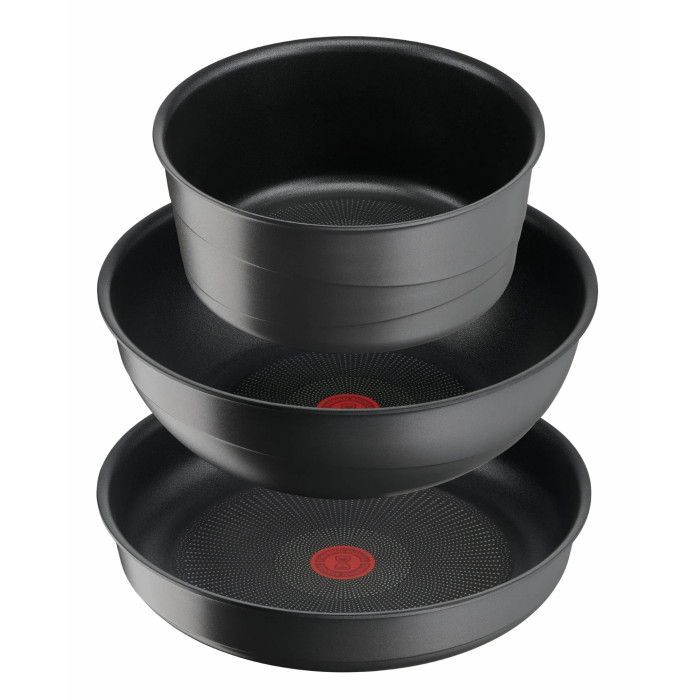 Набір посуду Tefal Ingenio Inspiration з литого алюмінію складається зі сковорідки 26 см, сотейника 20 см, сковороди WOK 26 см, двох кришок та знімної ручки Ingenio. Конструкція дає змогу готувати на плиті, використовувати посуд у духовці та ставити його в холодильник. Антипригарне покриття Titanium 3X спрощує приготування та очищення, а індикатор Thermo-Signal™ допомагає контролювати температуру нагріву.