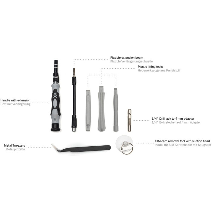 біти, інструменти для відкриття, пластикові підйомні інструменти, гнучкий подовжувач, інструменти для вилучення SIM-карти з присоскою, ручка з подовжувачем, 1/4» перехідник на 4 мм, пінцет