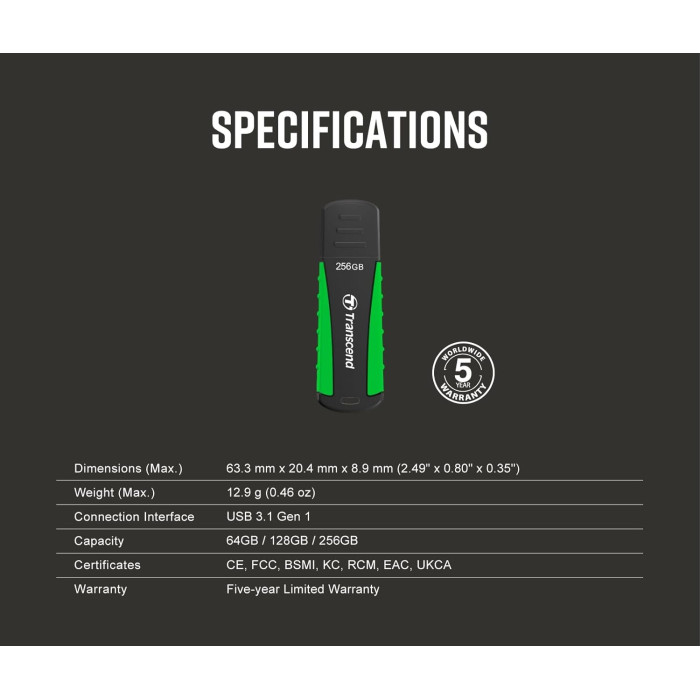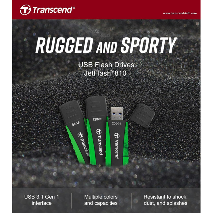 Transcend JetFlash 810 об’ємом 128 ГБ — захищений USB-накопичувач із інтерфейсом USB 3.1 Gen 1 та роз’ємом Type-A. Корпус із пластику та гуми підвищує стійкість до механічних впливів у повсякденному використанні. Компактні розміри та невелика вага спрощують транспортування. Оптимальне рішення для зберігання робочих файлів, мультимедійного контенту та резервних копій.