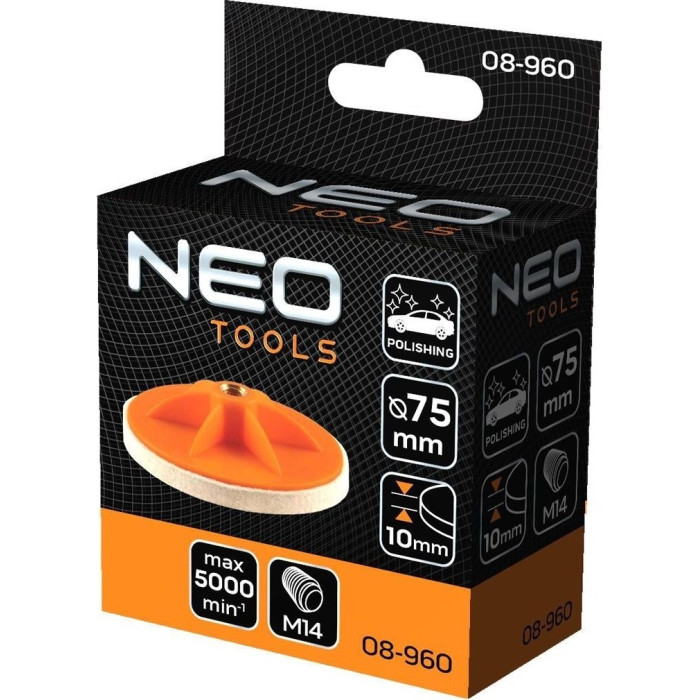 Полірувальний фетр NEO (арт 08-960) діаметром 75 мм і товщиною губки 10 мм, що кріпиться на різьбі М14. Виготовлений з натуральної вовни. Призначений для кутових шліфувальних машин. Засіб призначений для надання блиску нефарбованим хромованим, металевим, скляним і твердим пластиковим поверхням. Рекомендується використовувати при максимальній швидкості обертання 5000 об/хв.