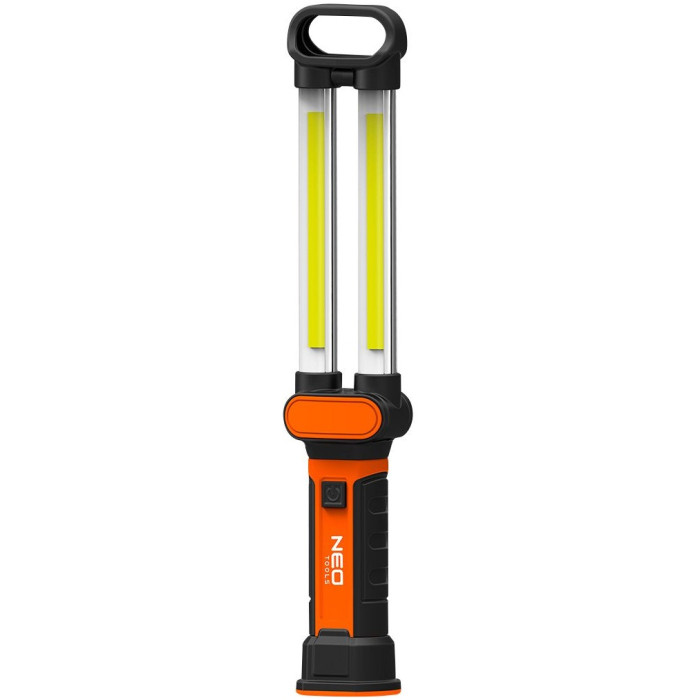 Акумуляторний світильник для майстерні NEO (арт. 99-066) оснащений світлодіодами COB зі світловим потоком 500 люмен і потужністю 6 Вт. Живлення здійснюється від літій-іонної акумуляторної батареї напругою 3,7 В та ємністю 2400 мАг, що входить до комплекту поставки. Складана конструкція дозволяє розташувати лампу відповідно до потреб користувача. Лампа має гачок, завдяки якому її можна зберігати і в підвісному положенні.