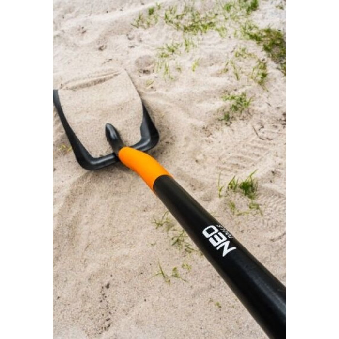 Совкова лопата NEO 95-011, головним чином, призначена для різноманітних сипучих матеріалів, таких як: пісок, земля, вугілля, щебінь, сніг, тощо. Цільнолита лопата загальною довжиною 1320 мм має загартоване профільоване полотно шириною 230 мм з високоякісної сталі, яке не деформується і зберігає свою форму, незважаючи на багаторічну експлуатацію. Ергономічна пластикова рукоятка D-типу і пластикове покриття трубки істотно впливають на комфорт використання інструменту. Прогумоване покриття рукоятки під пальці виключає натирання, забезпечує надійний хват. Між іншим, правильно загнуті краї запобігають ковзанню матеріалу.