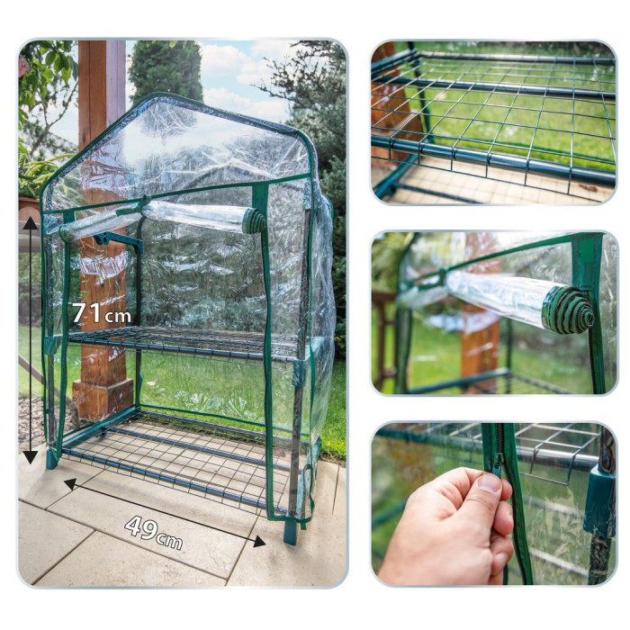 Для використання вдома та поза домом теплиця з металевою конструкцією та ПВХ плівкою від торгової марки NEO. Його розміри 69х49х95см. Він має дві практичні полиці, які дозволяють розмістити більше рослин у такому ж просторі. У теплиці чудові умови для вирощування зелені, дрібної розсади овочів та фруктів. Зручно закривається на блискавку - крім того, має можливість закатати передню стінку.Теплиця розкладна, тому в невикористаному стані не займає багато місця. Він має стабільну структуру та міцний металевий каркас з порошковим покриттям.