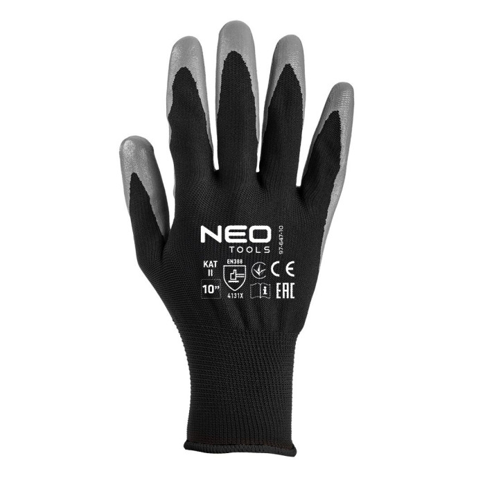 Робочі рукавички 97-647-11 від NEO TOOLS - це міцні та довговічні рукавички з поліестеру з нітриловим покриттям (гладкі), які підходять для широкого спектру застосування - транспортні роботи, садівництво, будівництво, переміщення та зберігання, складальні роботи, виробництво дрібних деталей, DIY та автомобілебудування.