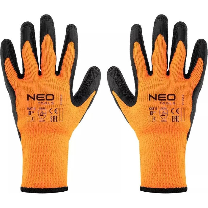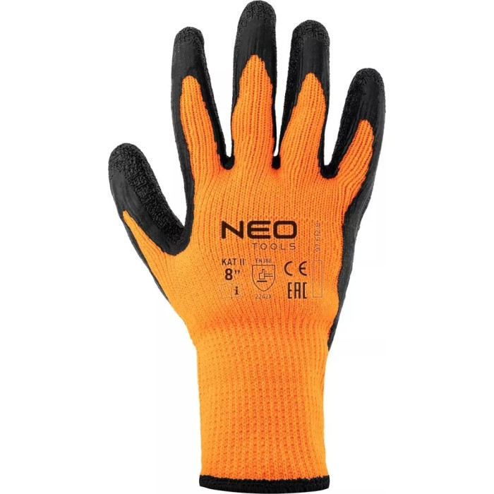Утеплені робочі рукавички NEO розміру 8, поліестер з латексним покриттям, 2242X 97-612-8, виготовлені з поліестеру з латексним покриттям. Вони мають високу стійкість до зносу (від 0 до 4) 2, стійкість до порізів гострими предметами (від 0 до 5) 2, стійкість до розривів (від 0 до 4) 4 та стійкість до проколів (від 0 до 4) 2. Вони також відрізняються стійкістю до порізів відповідно до EN ISO 13997 X. Рукавички добре сидять на руці. Вони можуть використовуватися для всіх видів транспортування, переміщення, зберігання, складальних робіт, виробництва дрібних деталей, DIY, автомобілебудування та садівництва. Вони захищають руки від холоду, бруду, подряпин, відбитків та шкідливих умов праці. При правильній конструкції - запобігає вислизанню інструментів з рук. Знак CE щодо відповідності стандарту EN 388, 22242X – це гарантія безпеки, яка доводить, що продукт марки NEO відповідає всім вимогам CE.