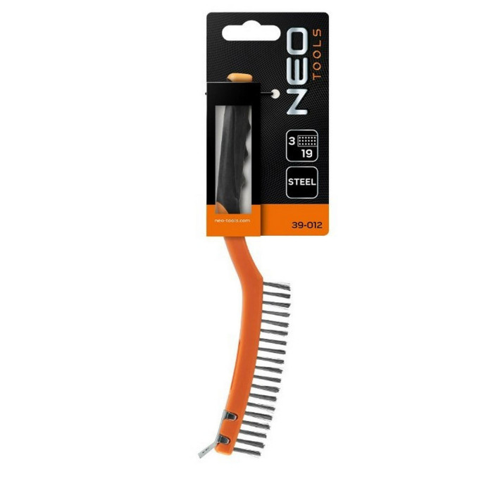 Щітка дротяна Neo Tools пряма, має 3 ряди по 19 дротів, що забезпечують ефективне очищення. Діаметр дроту становить 0.3 мм, що підходить для роботи з різними металевими поверхнями. Загальна довжина щітки — 345 мм, що робить її зручною для виконання робіт на великих поверхнях. Вона оснащена двокомпонентним руків'ям, що забезпечує комфорт і надійний захват. Щітка ідеально підходить для видалення іржі, фарби та забруднень. Це незамінний інструмент для майстрів та тих, хто працює з металом.