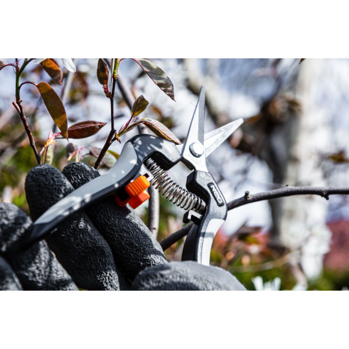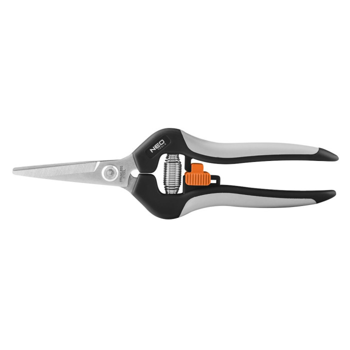 Секатор 185 мм для молодих пагонів, діапазон до 6 мм 15-207 NEO – інструмент, призначений для садових робіт. Підходить для роботи з невеликими та тонкими рослинами, догляд за якими потребує певної точності. Леза, оснащені мікронаконечниками, виготовлені із загартованої та додатково загартованої нержавіючої сталі. Ергономічна ручка надійно лягає в руку, а м'які елементи на ручці підвищують комфорт використання. Секатор має запобіжний механізм, який дозволяє заблокувати інструмент за допомогою однієї кнопки. Особливо рекомендується для догляду за кімнатними рослинами, деревами бонсай, садовими деревами, у теплицях або для складання флористичних композицій.