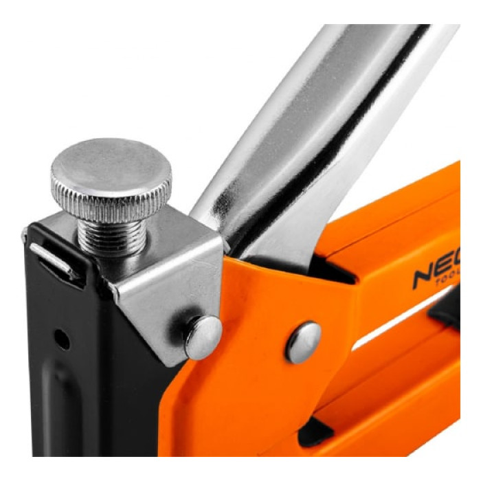 Степлер NEO Tools 4-14 мм, скоби J, сталь 16-032 призначений для роботи з меблями. Степлер має зручну ручку з функцією регулювання зусилля притиску скоб. Оснащений затискачем для кріплення на пояс та замком безпеки.
