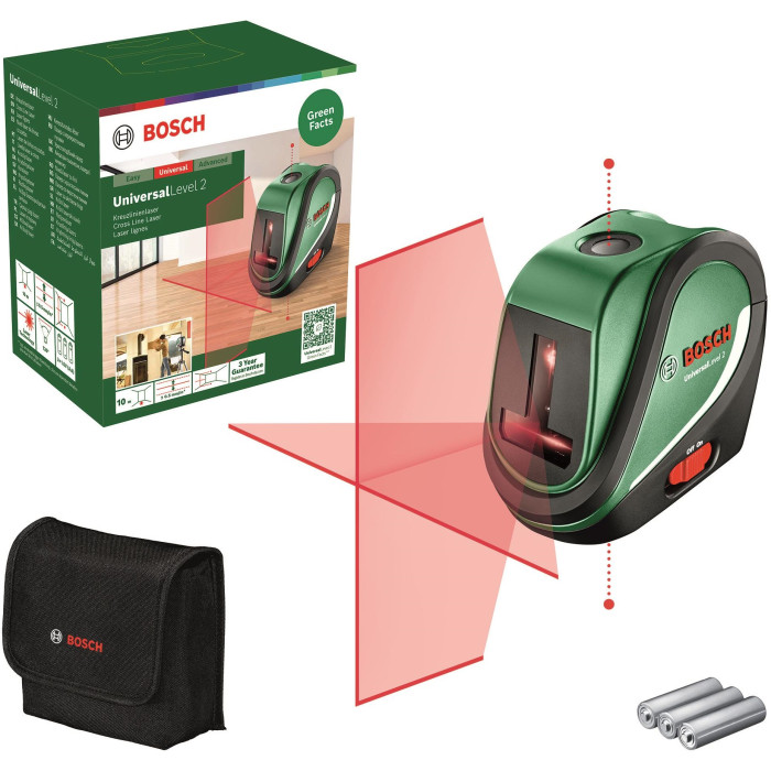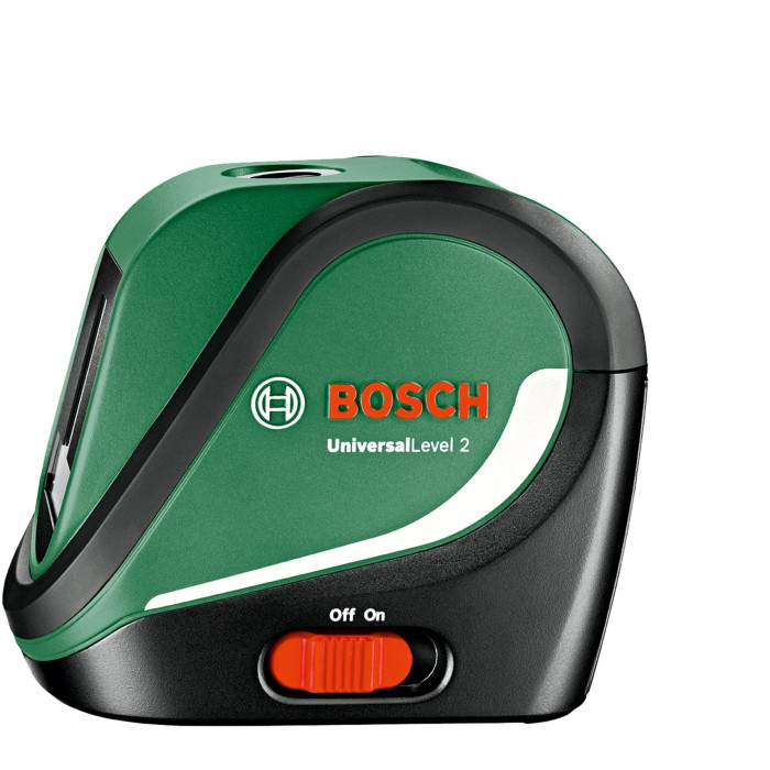 Bosch UniversalLevel2 - це простий і зручний лазерний нівелір, який ідеально підходить для домашнього використання. Він проєктує горизонтальну і вертикальну лінії, які допоможуть вам вирівняти картини, полиці, меблі та інші предмети.