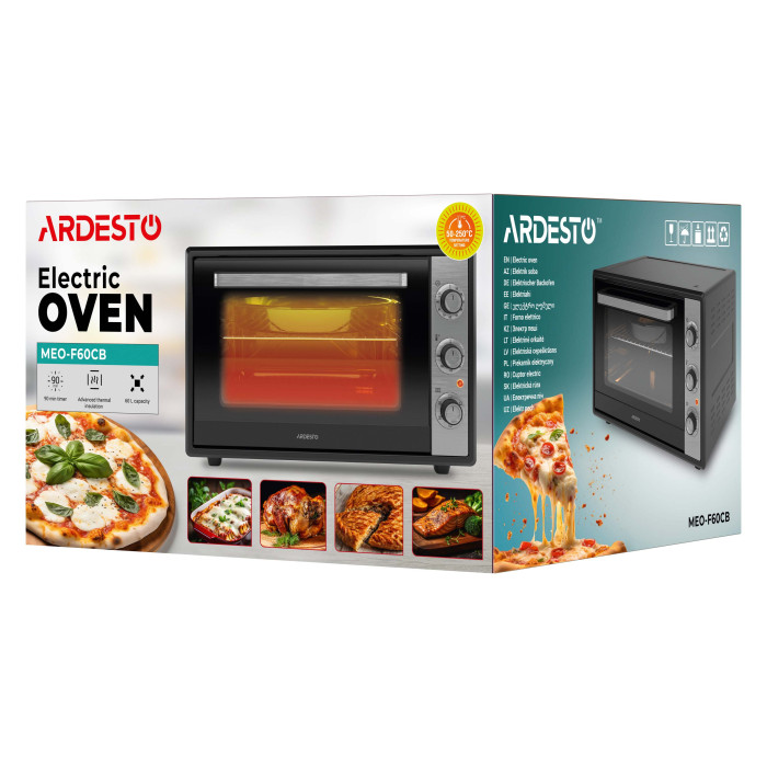 Електрична піч ARDESTO – надійний помічник на кухні для справжніх кулінарних експериментів! Завдяки об’єму 60 л і потужності 2 034 Вт вона забезпечує рівномірне приготування навіть великої кількості продуктів. Регулювання температури від 50 до 250 °C і 5 режимів, включно з конвекцією, зумовлюють можливість готувати страви різної складності. Із таймером до 90 хв та індикацією завершення процесу легко контролювати час, а внутрішнє освітлення додає зручності.
