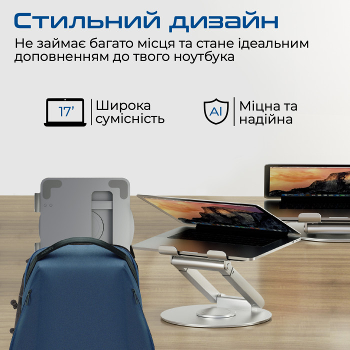 - Функціональна конструкція: Антиковзні накладки в парі з прогумованими упорами захищають від подряпин і надійно фіксують ноутбук