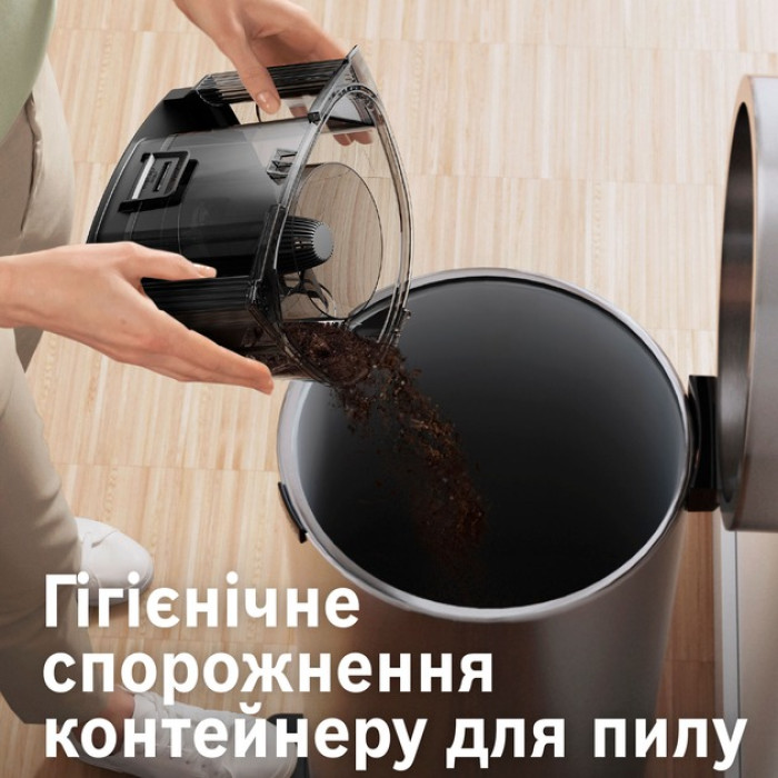 Подвійна гігієна з двома фільтрами. Один фільтр під контейнером для пилу й один на задній панелі пилососа, щоб забезпечити чистіше відпрацьоване повітря у вашому домі. Завдяки продуманому дизайну можна повністю очистити контейнер для пилу, не торкаючись фільтра - для ще більш гігієнічного обслуговування.