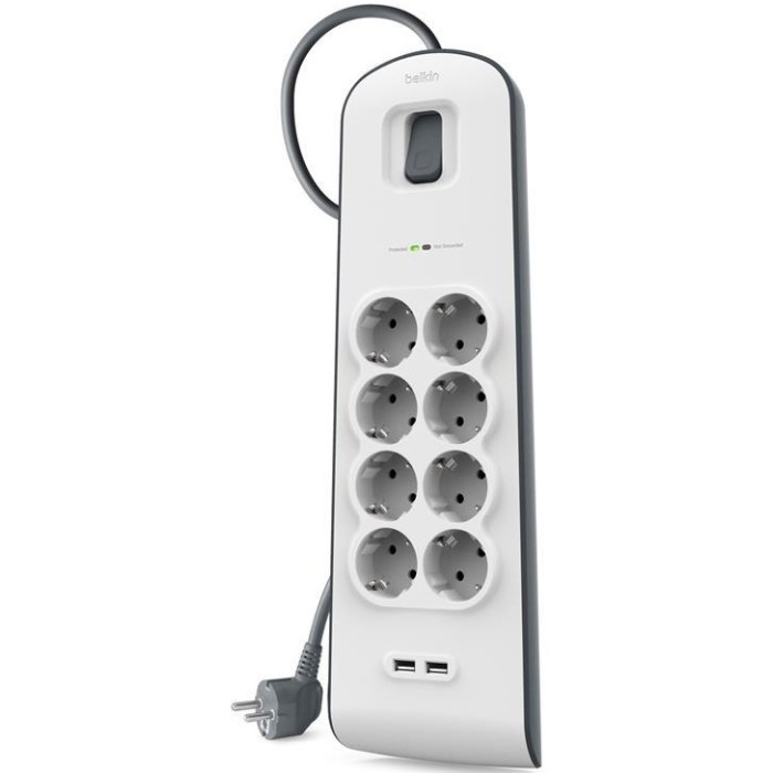 Подовжувач мережевий Belkin 2м, 8хТип, 16А, 2xUSB-A 2.4A, фільтр, білий