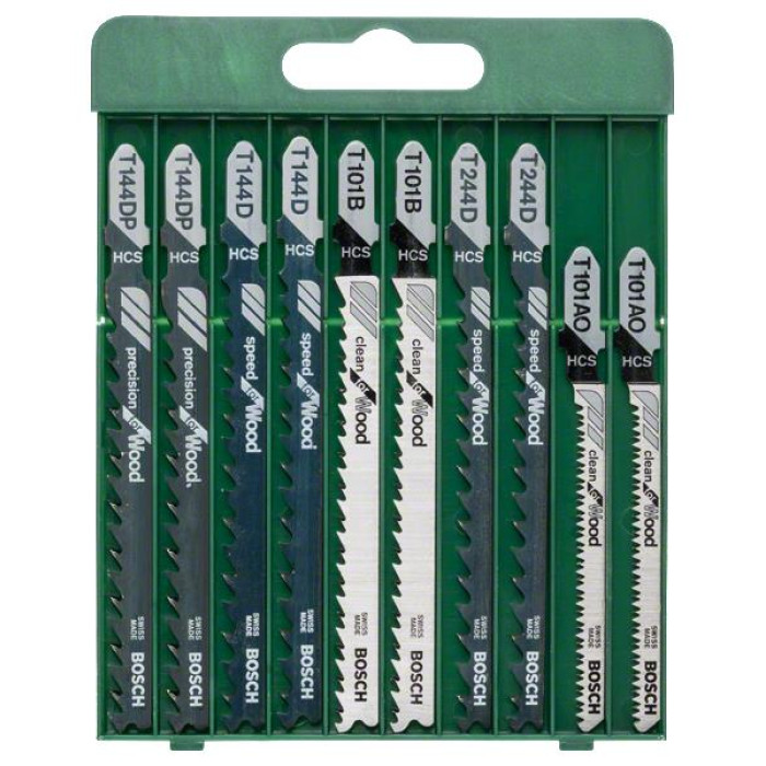 Комплектуючі представлені в п'яти видах з різним призначенням: T119BO, T144D, T127D, T101B і T118A, кожен з яких наявний в двох примірниках. Всі полотна з набору змінних пилок для електролобзика Bosch SET T-ХВ зроблені з легкого бі-металу підвищеної міцності, що гарантує тривалий термін експлуатації і стійкість до негативних зовнішніх чинників. Якісна заточка забезпечує точний різ.