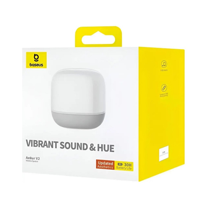 Бездротова Bluetooth колонка Baseus Aequur V2 поєднує компактність, стильний дизайн і потужне звучання. Підключається до всіх пристроїв, що підтримують технологію Bluetooth. Акумулятор об'ємом 1800 мАг забезпечує безперервну роботу колонки до 30 годин. Заряджається аксесуар приблизно 2.5 години. У комплекті є зарядний кабель USB-C.ПОТУЖНІСТЬ40-міліметровий динамік потужністю 4 W дає яскравий якісний звук на всі 360°. Пасивна низькочастотна резонансна діафрагма надає басам більше глибини. Чітке та деталізоване звучання акустики гарантовано припаде до смаку всім меломанам. Чутливі сенсорні кнопки управління на верхній панелі дають змогу вмикати та вимикати колонку, ставити треки на паузу, регулювати гучність. Також є 3 режими еквалайзера.ШВИДКІСТЬ ТА НАДІЙНІСТЬВерсія Bluetooth 5.0 забезпечує швидке і стабільне підключення пристроїв. Підтримка TWS дає змогу з'єднувати дві колонки Baseus Aequur V2 Moon для створення потужнішої стереосистеми. Помірне оформлення пристрою ідеально доповнить будь-який інтер'єр. Колонка тактильно приємна завдяки покриттю високоякісних матеріалів. Невеликий розмір акустики дає змогу використовувати її як вдома, так і на вулиці.