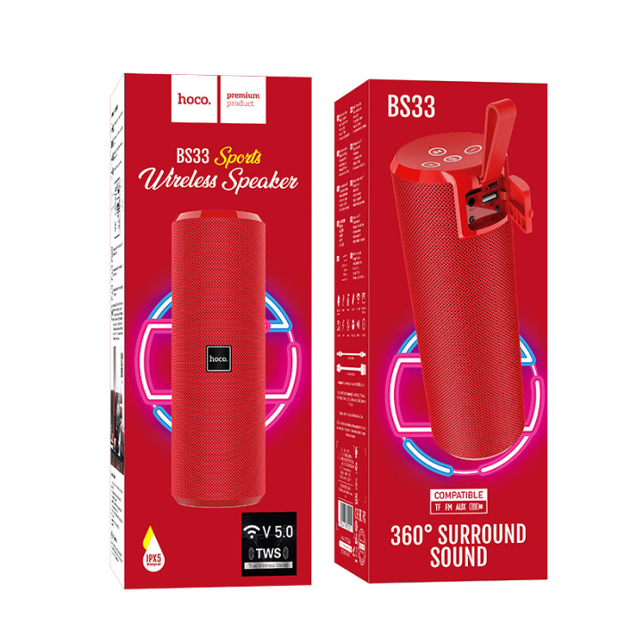 HOCO BS33 Voice sports wireless speaker Red ─ стереосистема з підтримкою Bluetooth 5.0, FM-радіо, сенсорним управлінням і повним набором інтерфейсів. Завдяки захисту IPX5, легкій вазі, компактним розмірам, циліндричній формі і наявності ремінця, ця колонка — відмінний вибір для подорожей, пікніків, пляжних розваг.Матовий софт-тач пластик і тканинна оббивка під рогожку – задовольнять самі естетичні смаки. Колонка Hoco BS 33 Voice оснащена 2 52-міліметровими динаміками сумарною потужністю 10 Вт, що забезпечують чисте збалансоване звучання в діапазоні 40 - 20000 Гц. Музику можна слухати по Bluetooth, через AUX, а також з флеш-накопичувачів і SD-карт.Блок роз'ємів закривається захисною силіконовою заглушкою, щоб уникнути попадання вологи і засмічення. Управління сенсорне з підсвічуванням. Вбудований мікрофон з функцією шумозаглушення забезпечує прийнятну якість мови при дзвінках. Hoco Bs33 Voice працює від 4 до 5 годин в залежності від рівня гучності, а заряджається 1.5-2 години від комплектного кабелю microUSB в захисній оплітці.