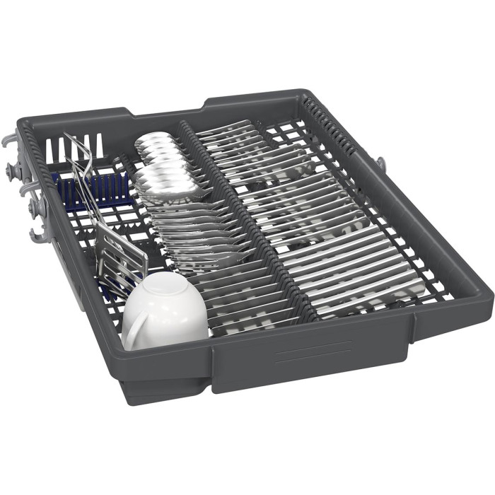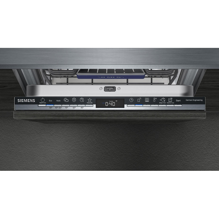 Вбудована посудомийна машина Siemens SR63HX66MK розрахована на 10 комплектів посуду та має компактну ширину 45 см. Підтримується керування через Home Connect з підключенням по WLAN. Модель оснащена третім кошиком, системою регулювання коробів rackMatic і інверторним двигуном iQdrive. Передбачено набір автоматичних програм і додаткові режими для гігієнічного миття. Індикація InfoLight відображає статус роботи на підлозі.