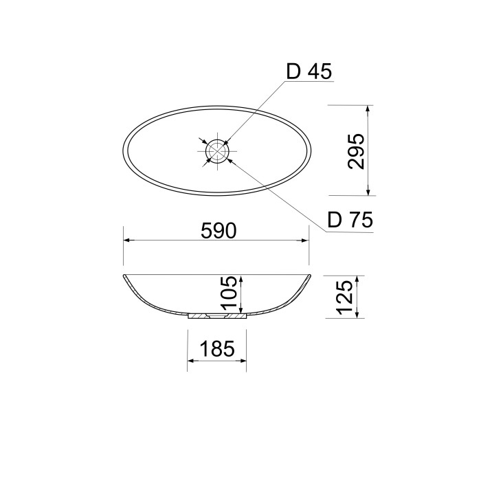 Раковина Adamant ANDERE NEW має овальну форму, виготовлена зі штучного каменю з розмірами 590 x 295 x 130 мм та чорно-білим кольором. Накладний тип встановлення без отвору для змішувача та переливу дозволяє гнучкий монтаж на стільницю чи тумбу. Матеріал складається з 80% литого каменю та 20% сантехнічної штучної кераміки, стінки товщиною до 20 мм. Поверхня гладка, стійка до барвників та хімічних речовин, витримує температуру до +165°C.
