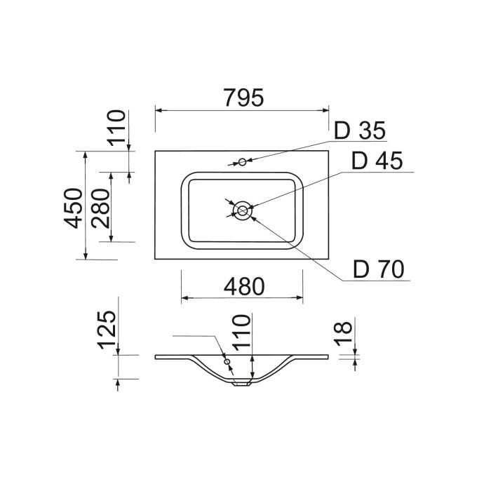 Раковина Adamant FRATE має прямокутну форму, виготовлена зі штучного каменю з розмірами 795 x 450 x 125 мм та білим кольором. Накладний тип встановлення з отворами для змішувача та переливу дозволяє монтаж на тумбу. Мате... Читати далі...