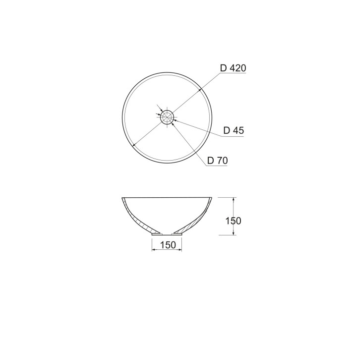 Раковина Adamant KREIS має круглу форму, виготовлена зі штучного каменю з розмірами 420 x 150 мм та білим кольором. Накладний тип встановлення без отвору для змішувача та переливу дозволяє монтаж зверху на стільницю. Матеріал створений за технологією Solid Surface, стійкий до впливу та довговічний.