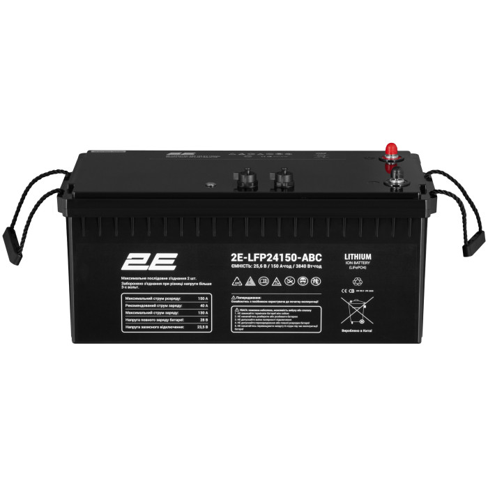 Акумуляторну батарею 2E LFP24 (модель 8S) призначено для систем безперебійного живлення в галузі телекомунікацій, конвенційного та альтернативного електроживлення. Корпус виготовлено з ABS-пластику. Витримує 6 000 циклів заряджання / розряджання. Номінальна напруга становить 25,6 В, а номінальна ємність – 150 А·год (0,2С до 22,5В при 25 ℃). Діапазон робочої напруги 22,5 – 28,0 В. Пасивне охолодження, яке не створює додаткового шуму. Інтерфейси обміну даними: RS485 / CANBUS.
