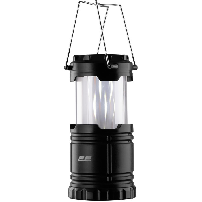 Кемпінговий ліхтар 2E-PLBL3AA зі світловим потоком 150 люмен має два типи світіння: «полум’я» та біле LED-освітлення потужністю 3 Вт. Дальність світла становить 10 м. Корпус чорного кольору виготовлено з пластику, клас захисту IPХ44. Ліхтар має висувну складану конструкцію, зум для регулювання діаметра світлового променю та п’ять режимів освітлення: потужне, середнє, низьке, стробоскоп та SOS. Працює від трьох батарейок АА, час роботи становить від 2 до 5 годин.