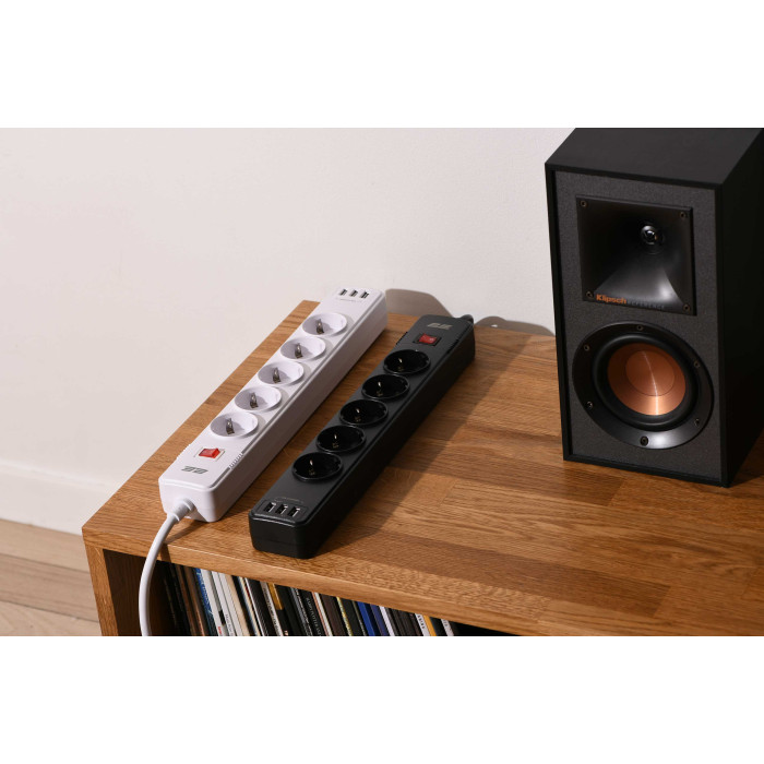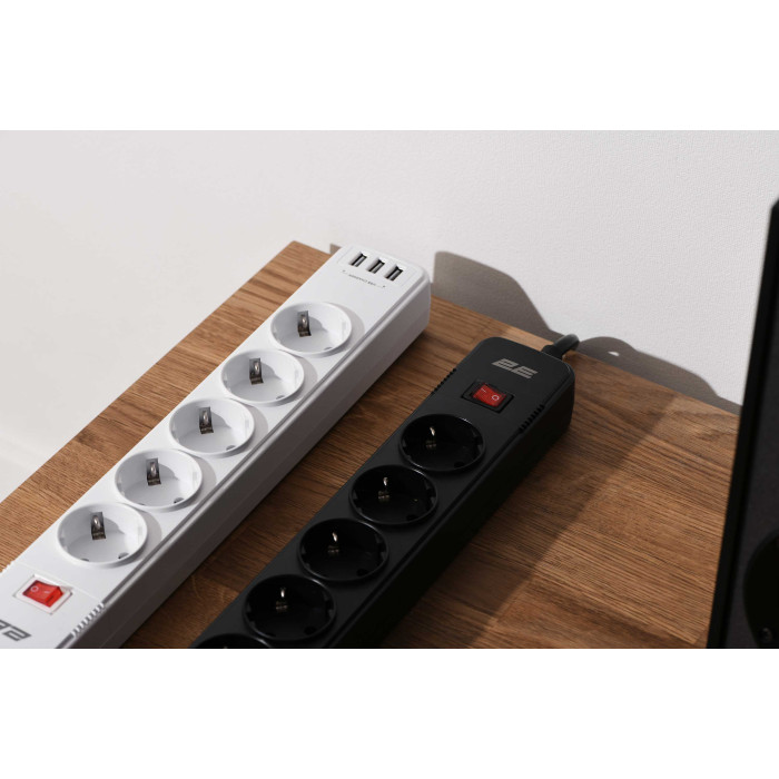 Сетевой фильтр 2E имеет пять розеток, расположенных под углом 45°, чтобы вилки устройств не мешали друг другу. Для зарядки мобильных устройств предусмотрено три разъема USB-A. Корпус изготовлен из огнеупорного PC-пластика, что обеспечивает высокую термостойкость и предотвращает возникновение пожара. В кабеле сетевого фильтра длиной 2 м изолирована каждая жила: трехжильный H05VV-F с сечением 1,5 мм. Материал проводника – 100% медь. Именно эти особенности обусловливают допустимую максимальную нагрузку на устройство 3 680 Вт.