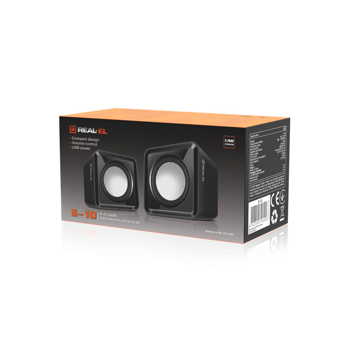 REAL-EL S-10 – компактне та звичайне рішення для щоденного використання. Мультимедійна USB-акустична система REAL-EL S-10 – це легке та доступне рішення для відтворення звуку з комп’ютера чи ноутбука. Завдяки компактному дизайну колонки займають мінімум місця та ідеально підходять для невеликих робочих столів.