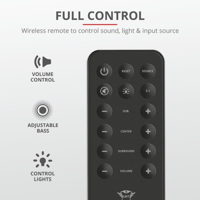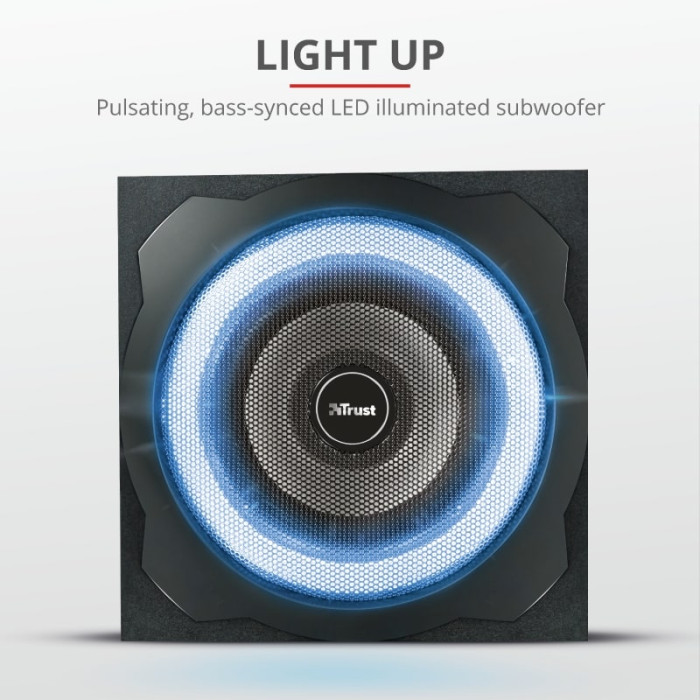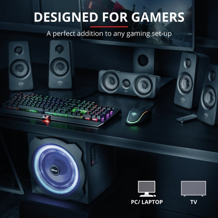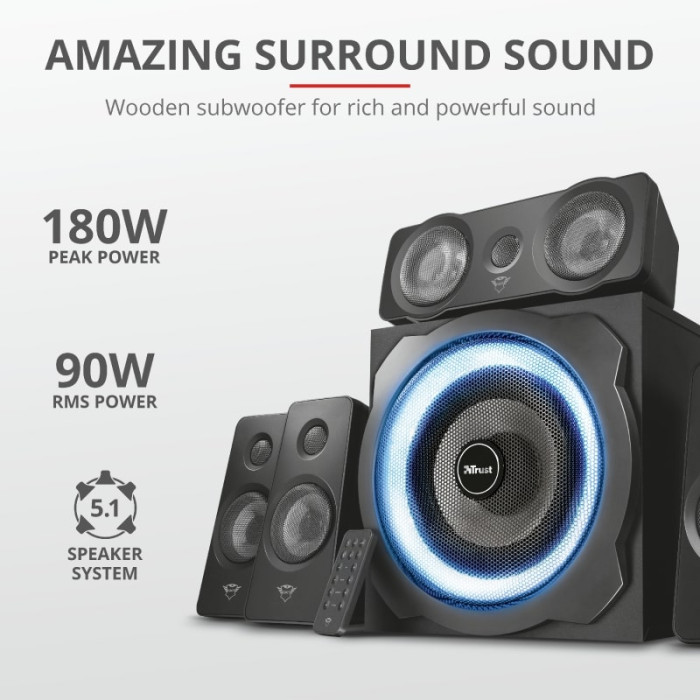 Trust GXT 658 Tytan 5.1 Surround - це комплект динаміків 5.1, в який входить дерев'яний сабвуфер із загальною середньоквадратичною вихідною потужністю 90 Вт (максимальна потужність - 180 Вт). Оснащений дротяним пультом дистанційного керування, щоб легко відрегулювати налаштування за вашими уподобаннями. Модель оснащена різнокольоровими світлодіодами RGB, які плавно перетікають з одного кольору в інший.