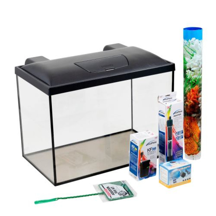 Повністю готовий акваріумний комплект, до якого входить: акваріум, кришка з LED-лампою, обігрівач, фільтр, фон акваріумний, сачок, килимок під акваріум.